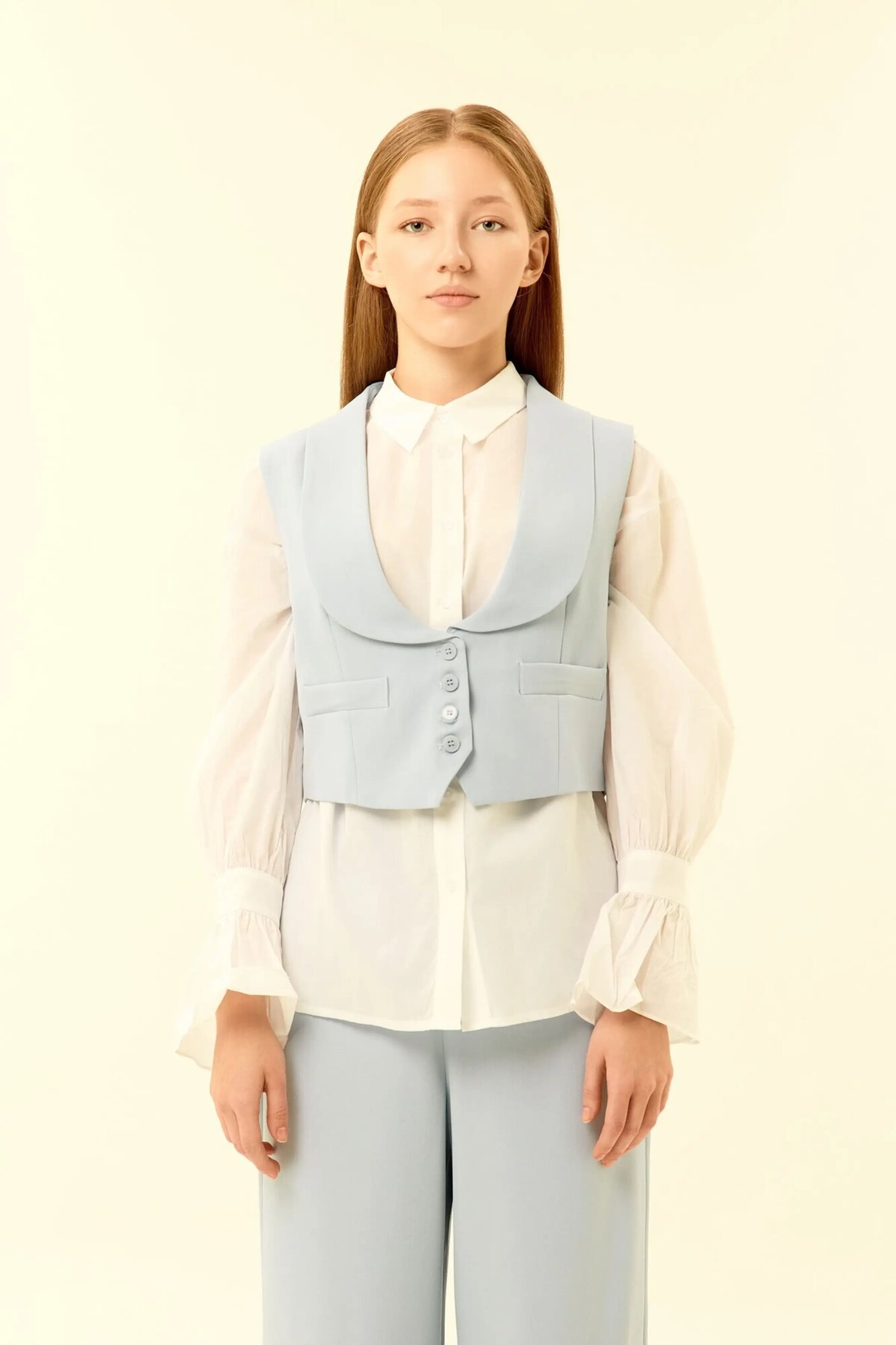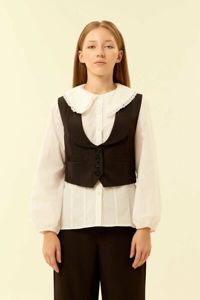 Жилетка классического кроя выполнена из плотного костюмного материала, который держит форму и подчеркивает аккуратный силуэт. Спереди модель застегивается на пуговицы и дополнена имитацией прорезных карманов, что придает изделию деловой характер. Глубокий вырез делает жилетку выразительной и стильной, позволяя сочетать ее с блузами, рубашками или топами. На спинке предусмотрен регулируемый ремешок, благодаря которому можно подогнать изделие по фигуре. Универсальный дизайн жилетки позволяет использовать ее как элемент офисного стиля, так и для создания более кэжуал-образов. Ткань отличается износостойкостью и сохраняет первоначальный вид при регулярной носке. Такая модель станет базовым элементом гардероба и подчеркнет как строгость, так и индивидуальность стиля.