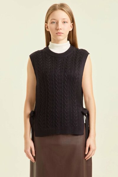Жилетка с фактурным вязаным узором и аккуратным прямым силуэтом, создающая уютный и продуманный образ. Модель выполнена без рукавов и имеет открытые боковые линии, которые фиксируются мягкими завязками, позволяя регулировать посадку и добавляя лёгкий эффект многослойности. Объёмный узор в виде плотной косы придаёт изделию визуальный рельеф и глубину, сохраняя универсальность и спокойный характер модели. Жилетка гармонично сочетается с водолазками, рубашками или тонкими топами, помогая создавать образы для повседневных прогулок, учёбы или работы. Такая модель подходит как для базовых, так и для более собранных комплектов, обеспечивая ощущение тепла, комфорта и аккуратности в каждом движении.