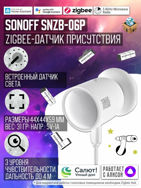 Sonoff SNZB-06P — датчик присутствия с микроволновым радаром 5,8 ГГц Создайте умный дом с автоматическим управлением светом и энергосбережением. Фиксирует даже малейшие движения, включая дыхание и пульсацию. Точное обнаружение присутствия
