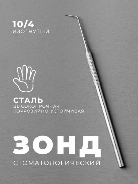 Зонд изогнутый 10/4 из стали, серый металлик — это надежный инструмент, предназначенный для использования в стоматологии. Его основное назначение — обеспечить точность и эффективность во время проведения стоматологических процедур. Благодаря этому зонду, осмотр полости рта проходит с высоким уровнем детализации. Инструмент имеет ряд важных технических характеристик. Он изготовлен из высокопрочной коррозийно-устойчивой стали, которая гарантирует долговечность и надежность работы. Цвет зонда — серый металлик, что придает ему стильный и профессиональный вид. Основные функции данного зонда включают в себя проведение осмотра полости рта и выявление различных проблем зубов или десен. Инструмент имеет гибкий изогнутый наконечник, который позволяет более аккуратно и легко обследовать труднодоступные места. Специальные радиационные узоры помогают предотвращать скольжение пальцев, обеспечивая безопасную и комфортную работу. Этот зонд незаменим в практической деятельности стоматолога и используется для различных процедур. Он позволяет эффективно проводить удаление налета и зубного камня, иглозатирание и выявление кариеса, что улучшает качество диагностики и увеличивает шанс на своевременное и эффективное лечение.