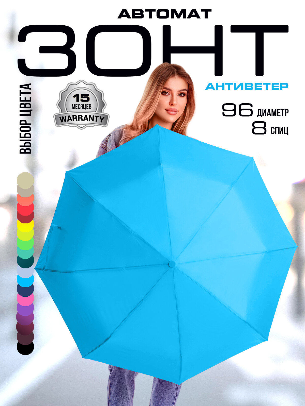 Зонт женский автомат однотонный облегченный, 3 сложения. У нас представлено 18 расцветок этой модели от нежных светлых до ярких неоновых, на любой вкус и возраст. Вес зонта всего 350 гр, длина в сложенном виде 28 см, длина ручки 55 см, диаметр купола 96 см, количество спиц 8 шт. Материал спиц- стекловолокно. Стержень - нержавеющая сталь с антикоррозионным покрытием. Ручка - нескользящая прорезиненная Soft Touch, делает использование зонта более удобным и комфортным. Материал купола - плотный эпонж, смесь полиэстера с хлопком и специальной пропиткой, которая отталкивает влагу. Одно из преимуществ модели - система антиветер, специальная пружина, которая защищает от поломок и выворачивания зонта при сильном ветре. Купол может выгнуться, при этом не сломается. Такая конструкция увеличивает срок службы зонта и обеспечивает надежную защиту от непогоды. Легкий вес, компактность зонта делают его идеальным для путешествий, прогулок и ежедневного использования в дождливую и в солнечную погоду. Зонт легко поместить в сумку, рюкзак, чемодан, портфель, школьный /студенческий рюкзак. Большая палитра от светлых нежных до ярких кислотных отлично подойдет к любому стилю и образу, на каждый день школьнику/школьнице, студенту, подростку, женщине, мужчине. Зонт DINIYA «унисекс» станет идеальным и практичным подарком для женщины: мамы, жены, дочки, бабушки, коллеги, подруги и для мужчины: мужа, сына, отца, дедушки, брата. Это идея универсального подарка на любой праздник, день рождения, Новый год, 23 февраля, 8 марта, день учителя. Фабрика DINIYA - производитель зонтов от создания дизайна до производства готовой продукции, с применением самых передовых инновационных технологий. Фабрика предоставляет гарантию на зонты 6 месяцев.