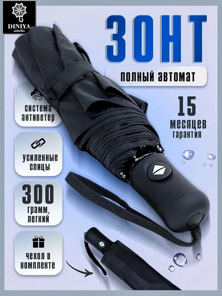 Зонт автомат антиветер однотонный черный от бренда DINIYA – идеальный аксессуар для любого времени года. Этот складной зонт с автоматическим механизмом складывания и водоотталкивающим покрытием обеспечит вам удобство и защиту от дождя. Ручка из пластика Soft Touch добавляет удобство использования, а однотонный черный цвет делает его универсальным выбором для любого стиля одежды. Благодаря своей компактности, этот зонт легко поместится в сумочку или рюкзак, став вашим надежным спутником в любых погодных условиях. Вес зонта всего 300 гр, длина в сложенном виде 28 см. Прочный стальной каркас из нержавеющей стали с антикоррозионным покрытием со стержнем длиной 55 см. Зонт имеет 8 спиц из стекловолокна. Купол диаметром 96 см из ткани эпонж - с водоотталкивающей пропиткой. Зонт автомат удобно открывается и закрывается одной кнопкой. Преимущество модели - система антиветер, специальная пружина, которая защищает от поломок и выворачивания зонта при сильном ветре. Купол может выгнуться, но при этом не сломается. Универсальность и компактность зонта делают его идеальным для путешествий, прогулок и ежедневного использования в дождливую и солнечную погоду. Это незаменимый аксессуар для тех, кто ценит комфорт, стиль и надежность. Зонт легко разместить в сумку, чемодан, рюкзак, портфель. Вы легко сможете поделиться им со своими друзьями и членами семьи, когда им понадобится дополнительная защита от дождя! Фабрика зонтов DINIYA - это полный цикл от создания дизайна до производства готовой продукции, с применением самых передовых инновационных технологий. В комплект входит: зонт, непромокаемый чехол.