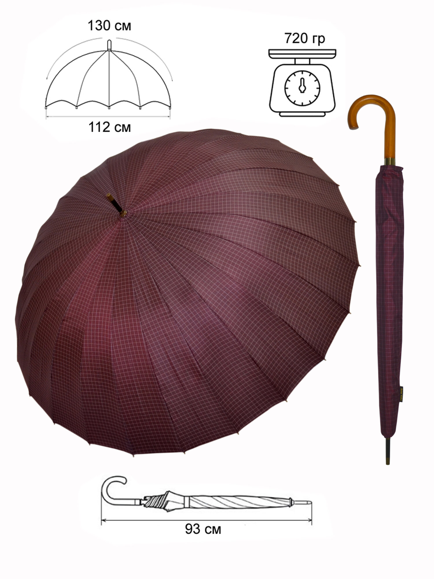 Достоинства:Деревянная ручка удобная, много спиц, большой купол Недостатки:Немного не хратает ремешка на чехле