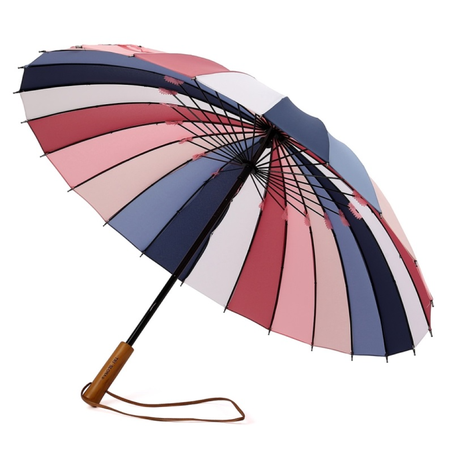 Женский зонт Трость торговой марки Три Слона (Tri Slona). Материал купола эпонж это хлопчатобумажная или шелковая ткань с шероховатой поверхностью, на которой вода превращается в капельки и скатывается, а сам зонт остается сухим. Ручка зонта выполнена из дерева, имеет длинный шнурок, дающий возможность ношения зонта через плечо. Зонт трость имеет усиленный каркас в 24 спиц. Конструкция зонта из комплекса пружин и звеньев спиц изготовлена из гибкого и упругого материала углепластика и фибергласса. Места сочленения спиц защищены от протирания дополнительными кусочками ткани. Пружины защищают зонт от поломок при выворачивании от ветра. Конструкция зонта выполнена из алюминия, раздвижной стержень из металла. Радиус купола -105 см.