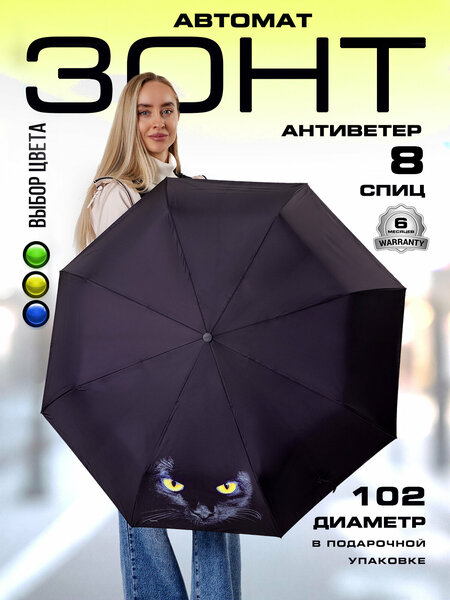 Зонт автомат черный женский легкий с принтом глаза кошки сочетает стиль и элегантность. Он обладает компактными размерами, 30 см в сложенной форме, диаметр 102 см, эргономичная ручка из пластика с нескользящим покрытием Soft Touch и тканевым хлястиком для подвешивания. Весом 400 грамм прочный стальной каркас и 8 крепких спиц из стекловолокна. Купол изготовлен из плотного материала эпонж с плетением нитей в виде смеси полиэстера и хлопка, с водоотталкивающей пропиткой. Наш механизм позволяет быстро открыть и закрыть зонт, гарантируя защиту от неожиданного дождя. Мордочка киски добавляет уникальности девайсу, делая его ярким аксессуаром. Подарочная упаковка превращает его в отличный презент для девушек и женщин, которые ценят функциональность. Популярная модель фабрики DINIYA складывается в три сложения с закрытием и открытием одной кнопкой, выполнена в лаконичном и минималистичном дизайне без декоративных элементов. Специальная пружина антиветер предотвращает выворачивание свод наружу при сильных порывах ветра, защищает от поломок. В комплекте двойной непромокаемый чехол для хранения. Завод производитель предоставляет гарантию на изделия сроком на 6 месяцев, что подчеркивает качество и надежность этого аксессуара.