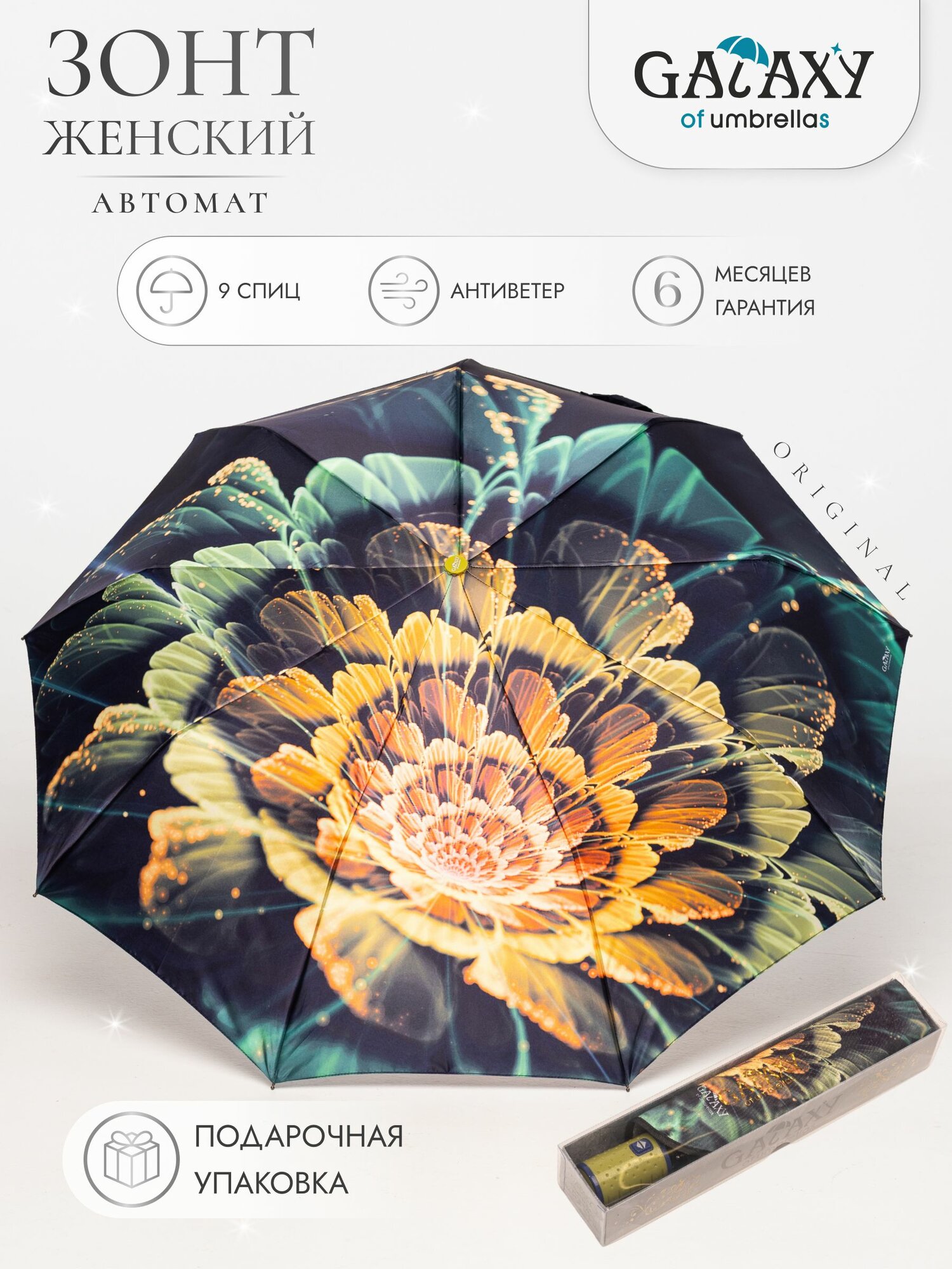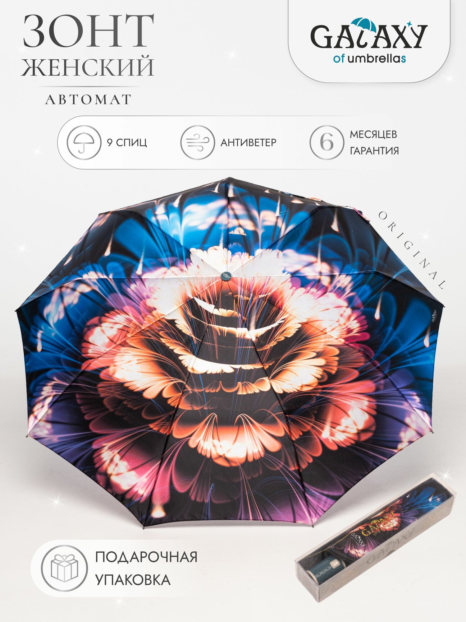 Зонт женский полуавтоматический. Зонтик от российского бренда GALAXY of umbrellas гарантирует надежность конструкций и стильный дизайн. Складной механизм полуавтомат. Складной зонт имеет прочный каркас с системой антиветер (антишторм) и имеет 9 карбоновых спиц, что добавляет еще большей прочности и надежности зонта. Несмотря на прочность, этот зонт довольно маленький и компактный, но в раскрытом виде диаметр его купола 105 см, что позволяет укрыться от дождя людям разной комплекции. Носить зонт лучше в чехле, который идёт в комплекте. Удобный и легкий зонт подойдет к любому образу и на различный возраст. Станет достойным хорошим подарком женщине, девушке на 8 марта, день рождения, новый год. А также идеально подойдет в качестве сувенира.