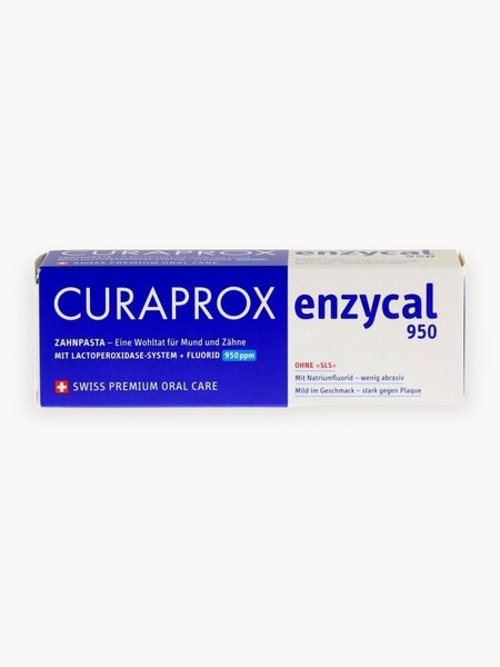 Лечебно-профилактическая низкоабразивная зубная био-паста Enzycal 950 против кариеса. Сохраняет естественную микрофлору полости рта. Не содержит лаурилсульфата (SLS) - предотвращает раздражение, значительно снижает риск возникновения афтозных язв, не препятствует действию хлоргексидина. Содержит три фермента (амилоглюкозидазу, глюкозооксидазу, лактопероксидазу), усиливающих антибактериальные свойства слюны, задерживают рост бактерий и восстанавливают естественный баланс ротовой полости. Внимание: Детям до 6 лет использовать пасту в меньшей дозировке, для того, чтобы минимизировать сглатывание. Не содержит глютен. Массовая доля фторида натрия: 950 ррм.