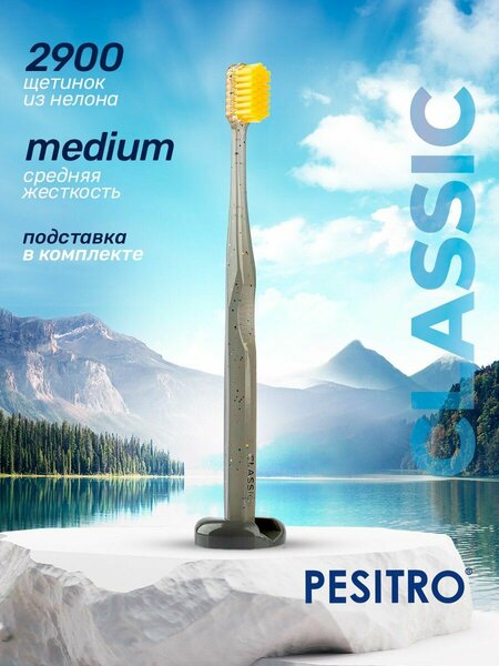 Зубная щетка Pesitro "Classic", средняя жесткость, с подставкой, цвет: серый